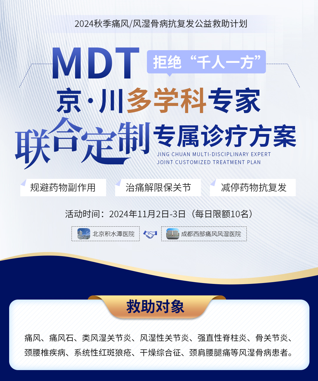 为帮助更多痛风、风湿骨病患者规避“统一治疗”方案误区,不出川即可享受到一站式优质专家诊疗服务,为患者制定个性化诊疗方案,规避药物副作用、保护关节功能防致残、减停药物抗复发。成都西部痛风风湿医院在11月2日-3日,特邀北京大学第四临床医学院、北京积水潭医院黄彦弘教授开展“2024秋季痛风/风湿骨病抗复发公益救助计划 ”,携手京·川多学科专家联合定制专属诊疗方案,同时发放【5重惠民援助】,减轻患者就医负担!